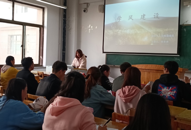 最后学习阶段是宣传部开展的关于“学风建设”的宣讲活动,由宣传部部长田丰卉进行宣讲,主要针对员工会制度,宿舍规章制度,教室纪律问题,希望全体学员能够有则改之,无则加勉。