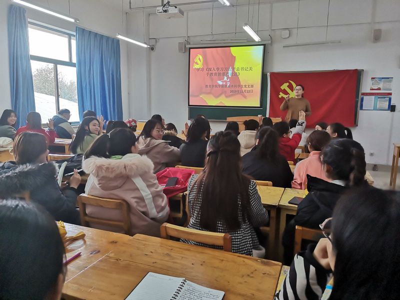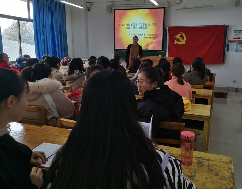 活动中,由学前教育本科员工党支部书记王颖领读《习近平关于‘‘不忘初心,牢记使命’’重要论述选篇》以及带领全体党员、预备党员学习《深入学习习近平总书记关于教育的重要论述》王颖同志强调:习近平总书记关于教育的重要论述,系统回答了一系列方向性、全局性、战略性重大问题,标志着我们党对教育发展规律的认识达到了新高度,为新时代中国特色社会主义教育提供了根本遵循。教育战线要参悟透、领会准、运用好总书记关于教育的重要论述。