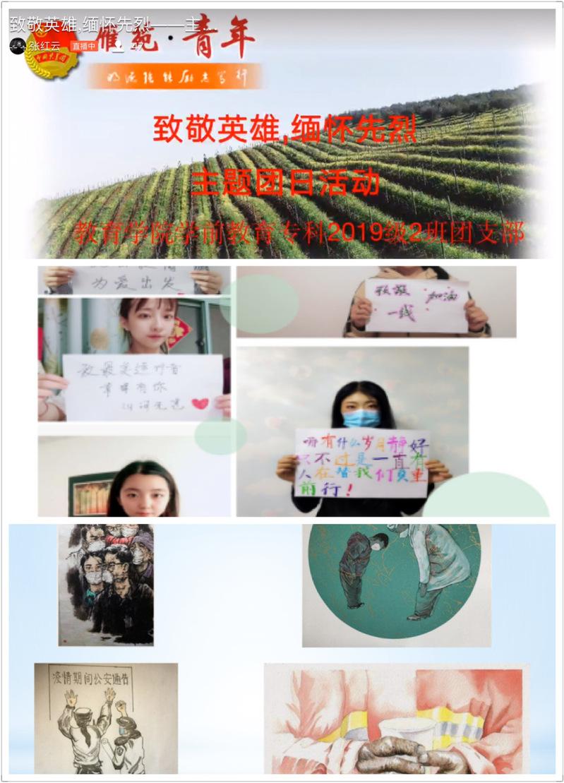 16级数学与应用数学1团支部围绕在此次战役中人们表现出的“雷锋精神”鼓励青少年积极学习和发扬他们的优秀品质17级学前教育专科班团支部诵读诗歌《你的样子》回顾抗役过程,向抗役英雄致敬18级学前教育一班的同学们表示要饮水思泉,不忘来路,向无数志愿者们致敬,向“逆行者”致敬,为无数奔赴武汉捍卫生命的英雄祝福,为生命祈祷19级学前教育专科二班团支部的同学们通制作的PPT讲述典型事例,让同学们真真切切的感受到白衣天使们舍小家顾大家的无私奉献精神和视死如归的高尚品质有不想当逃兵的李文亮有坚守病房的夏思思“如果万一,不要插管”的刘智明也有推迟婚期,壮烈牺牲的彭银华……还有千千万万像他们一样的烈士。无数的烈士用自己宝贵的生命,保障了人民群众的生命安全,确实如网友所说,他们不需要被神话,但需要被记住。他们为我们离开,在清明节来临之际为他们致以崇高的敬意。