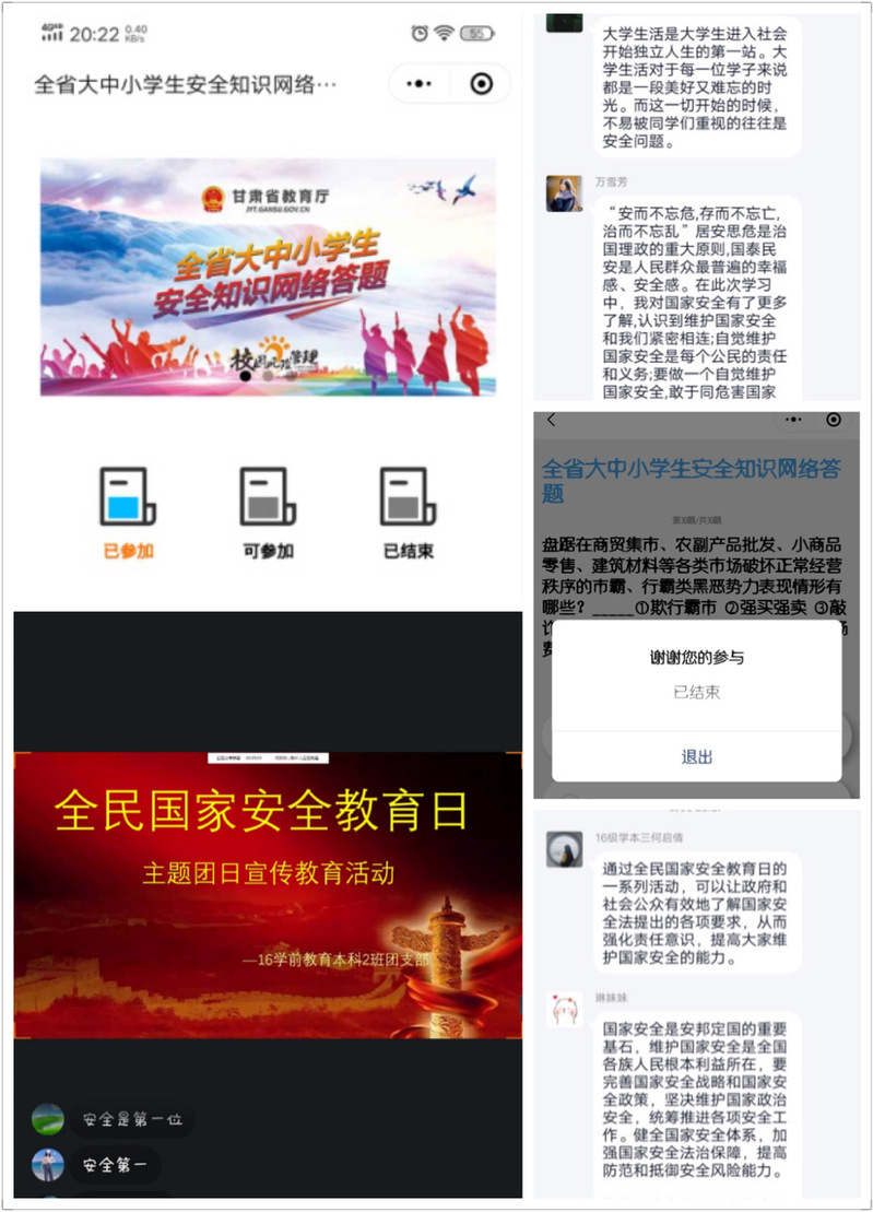 由于在疫情影响的特殊情况下,班团支部通过QQ、钉钉、微信、腾讯会议、等线上班级群进行团活动,大家分别通过观看新闻宣传片、微短片来学习《宪法》《中华人民共和国国家安全法》《反间谍法》等法律法规,还通过文字图片等方式来宣传普及法律,并且都在“校园风险管理工作平台”进行网络答题,使得同学们认识到维护国家安全的重要性,同时国家安全也是我们当代青年共同的责任;有些班级还通过观看纪录片《国家记忆》之《钱学森与中国航天60年》学习国家安全重要性,活动中大家都积极讨论自己认知的国家安全常识,活动最后各班团支部进行了作品征集。