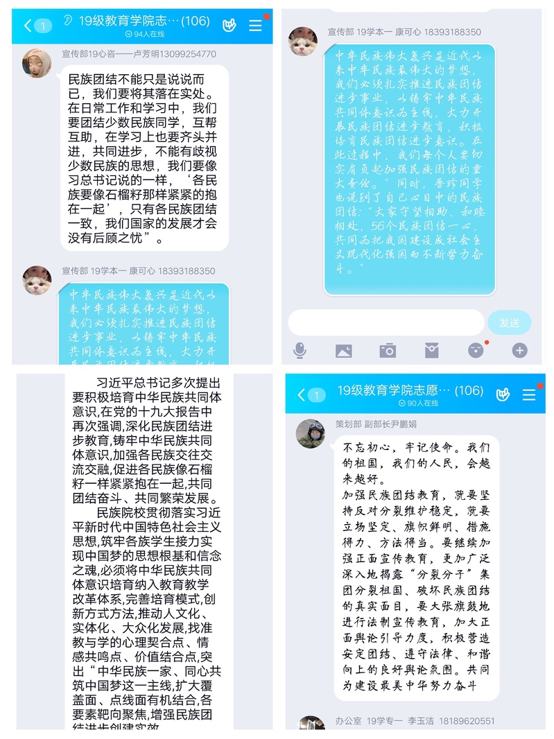 此次会议首先了解了民族团结的意义。在会议过程中,同学们积极发言,表达了自己关于民族团结的看法。其中,来自19级学专一班的卢芳明同学说到:“民族团结不能只是说说而已,我们要将其落在实处。在日常工作和学习中,我们要团结少数民族同学,互帮互助,在学习上也要齐头并进,共同进步,不能有歧视少数民族的思想,我们要像习总书记说的一样,‘各民族要像石榴籽那样紧紧的抱在一起’,只有各民族团结一致,我们国家的发展才会没有后顾之忧”。康可心同学也谈到了自己的看法,她说“中华民族伟大复兴是近代以来中华民族最伟大的梦想,我们必须扎实推进民族团结进步事业,以铸牢中华民族共同体意识为主线,大力开展民族团结进步教育,积极培育民族团结进步意识。在此过程中,我们每个人要切实肩负起加强民族团结的重大责任。”同时,普珍同学也说到了自己心目中的民族团结:“大家守望相助、和睦相处,56个民族团结一心,共同为把我国建设成社会主义现代化强国而不断努力奋斗。”