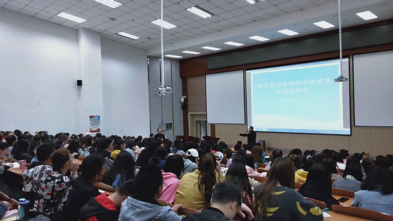 本次招聘会由人才招聘处联系新疆巴州轮台县教育和科学技术局与公司共同举办。轮台县第二小学董事长税国宾代表教育和科学技术局进行了精彩的招聘宣讲。通过讲解、播放宣传片等方式,详细地向同学们介绍了轮台县的历史、发展情况、未来规划、地理位置、交通概况、团队专业需求、教师食宿福利等各个方面的问题,并就同学们关心关注的问题进行了解答。