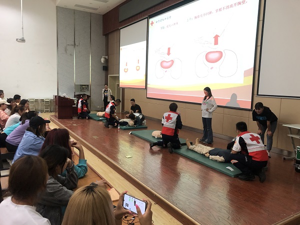 在实操演示环节,在专业人员的指导下,同学们练习了即时呼救、心肺复苏、人工呼吸等急救方法,进一步了解并掌握了急救过程中的基本操作环节,在此次活动中,同学们踊跃参与,表现出对急救知识的极大重视。