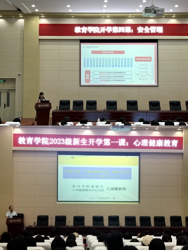 为深入贯彻落实党的二十大精神,指导和帮助2023级新生尽快了解和适应新环境,明确大学阶段学习目标,科学规划学习生活,以积极阳光心态迈好坚实的第一步,伟德结合新生入学教育安排,于9月11日-9月26日,举办“筑起人民防线,维护国家安全”“走近心理:心理问题的识别、预防与应对”“新起点、新征程—做一名合格的老员工”“老员工职业生涯规划”四场专题讲座。讲座分别由公司党总支书记、经理张莉、副经理王成德、副经理彭建奎、副经理李生彪主讲,2023级187名新生参加。